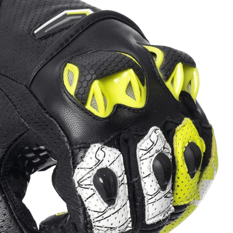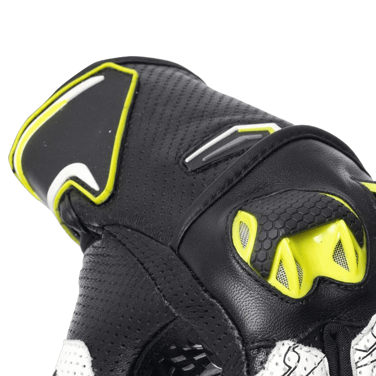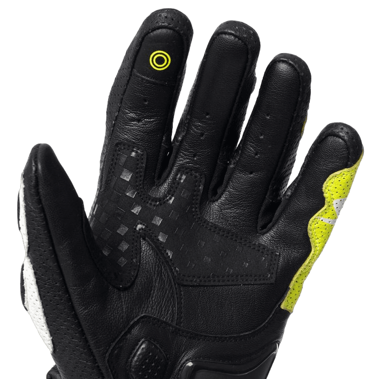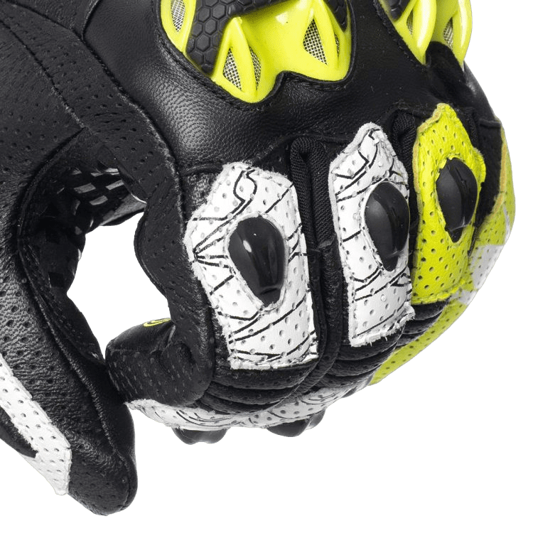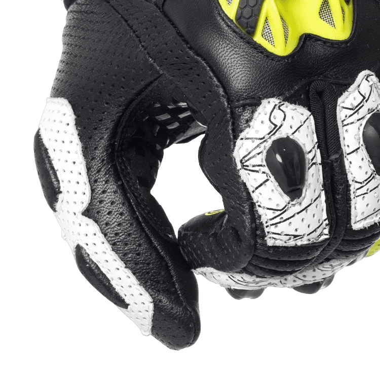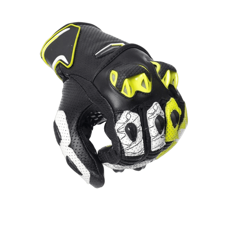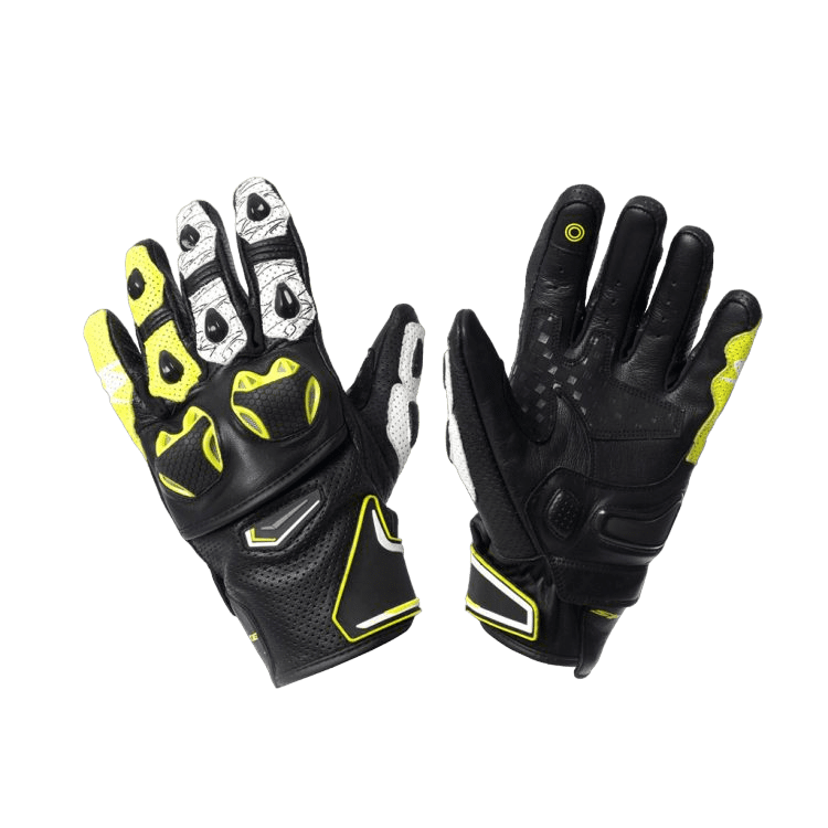 - Gants courts racing en cuir haut de gamme avec perforations pour la ventilation de l’air.